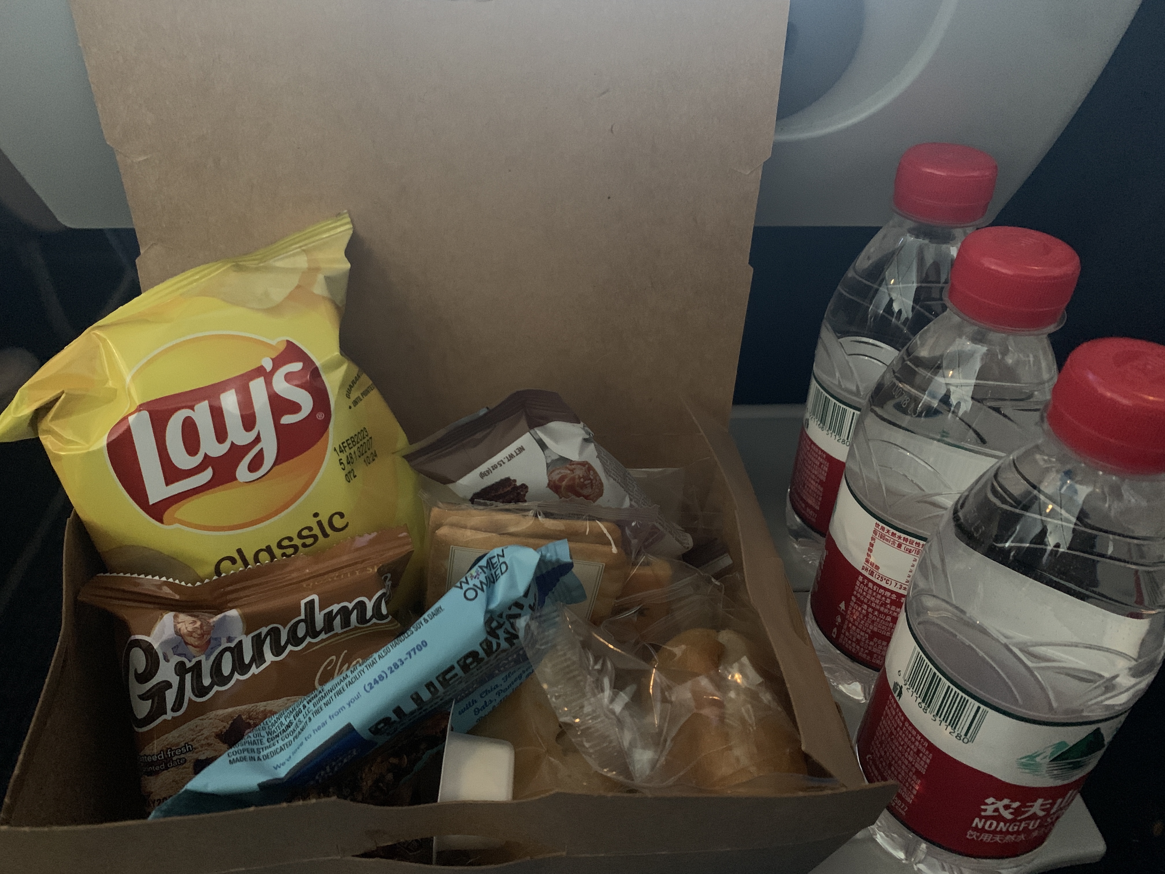 Airplane meals are a box of snacks with three bottles of water, reason for buffet before leaving.路途小零食,不给饭了。