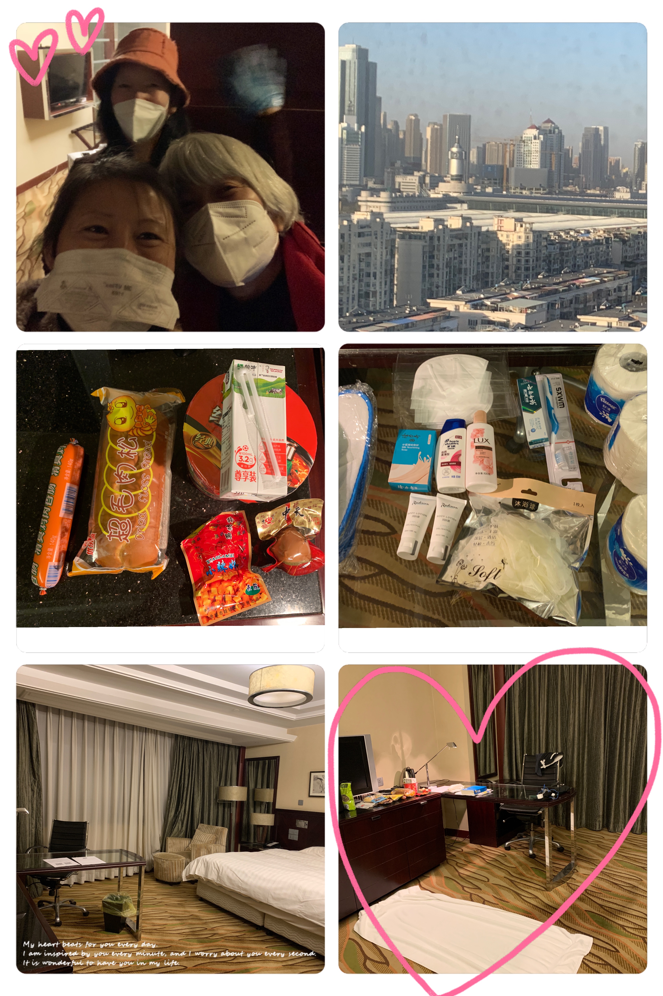 Me and my new friends. Hotel room is ok. Not very clean but acceptable. Set up my food corner and workout station. :) 一路上有刘阿姨和袁姐,我们成了好朋友,互相帮助。酒店还可以,可以看到东站,就是不是很干净,但面积不小,有地方让我铺好我锻炼用的“瑜伽垫儿” 。第一晚40元的夜宵和房间提供的必需品。