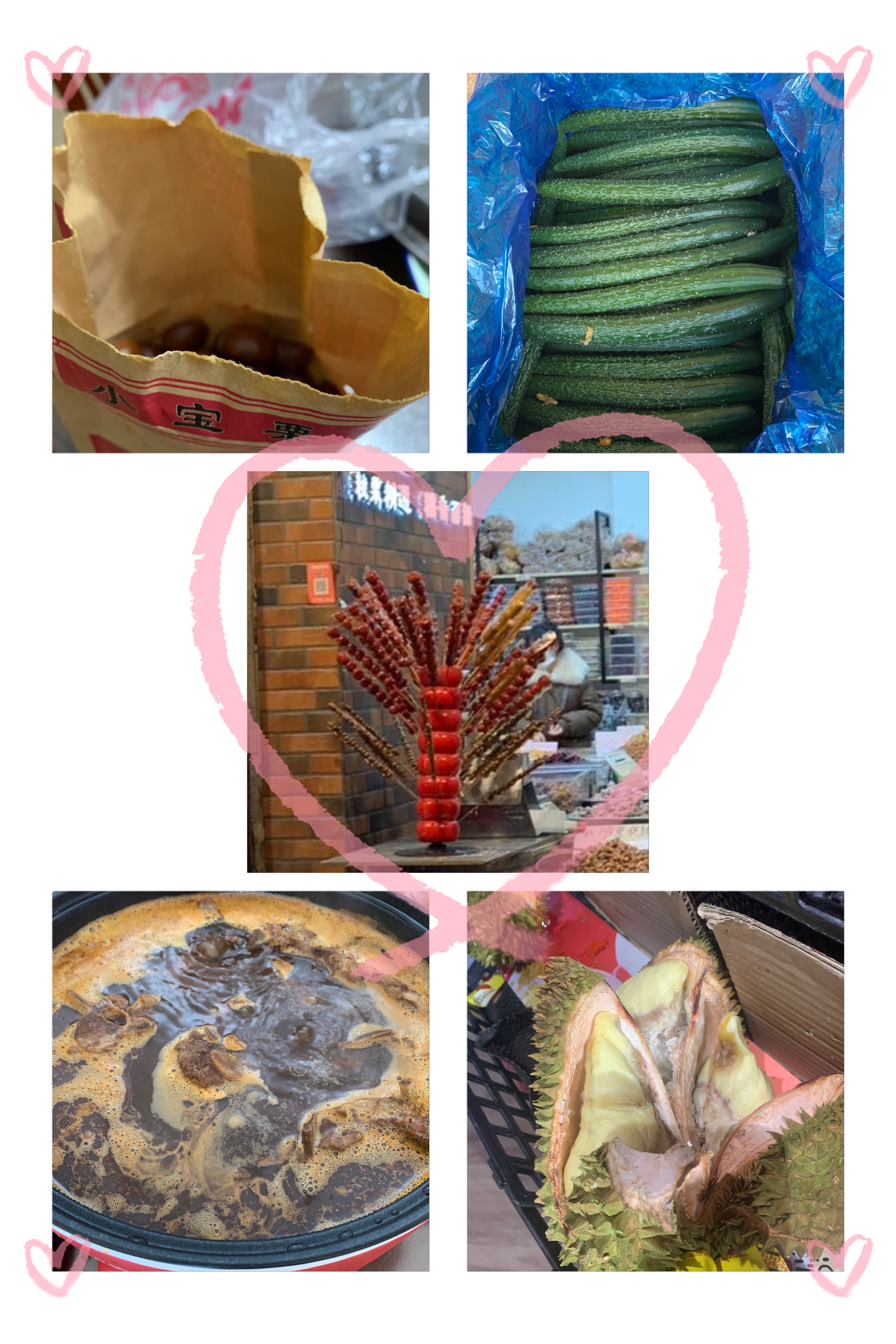 Roasted chestnuts, Tianjin cucumbers, sour berry coated with sugar skews, spicy lamb back bones, Duran…everything I like!