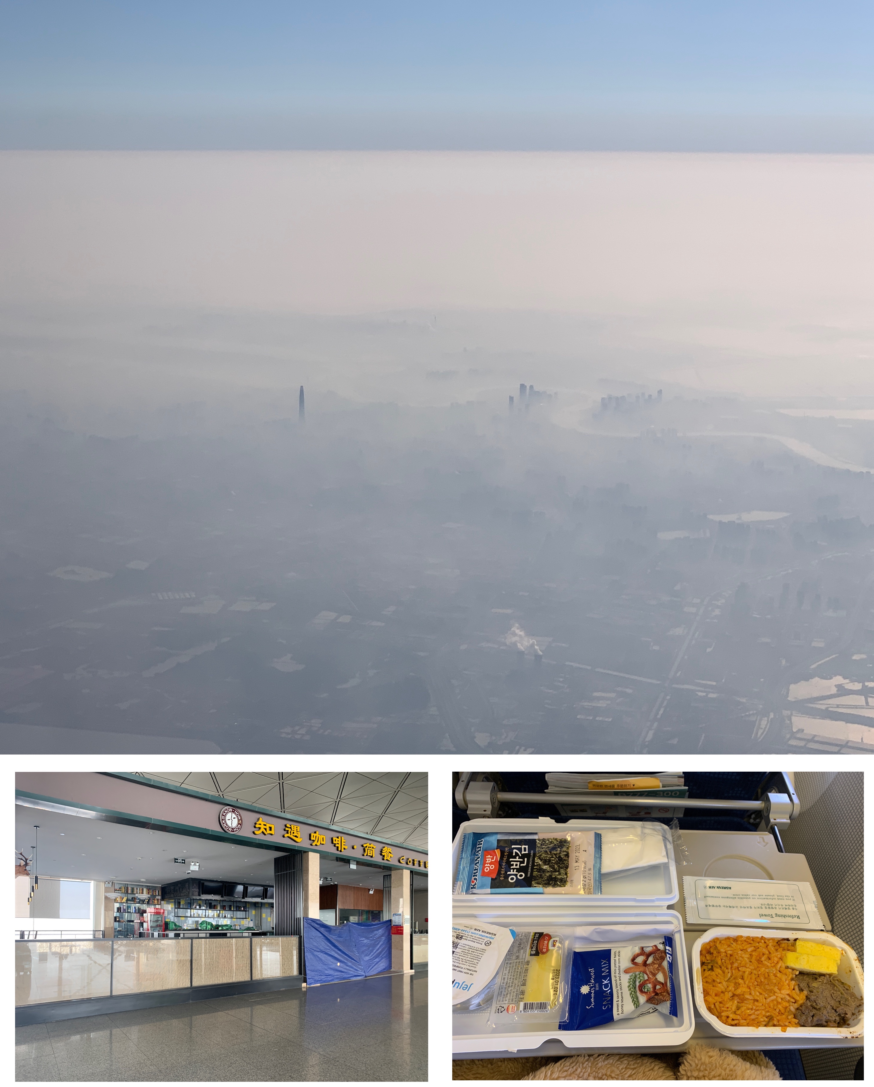 起飞后看到的天津,萧条的机场。两个小时的航班大韩还给了热乎乎的食品。国航13小时一包即食食品。Tianjin seen in the air. Airport looks empty. Food for 2 hours flight.