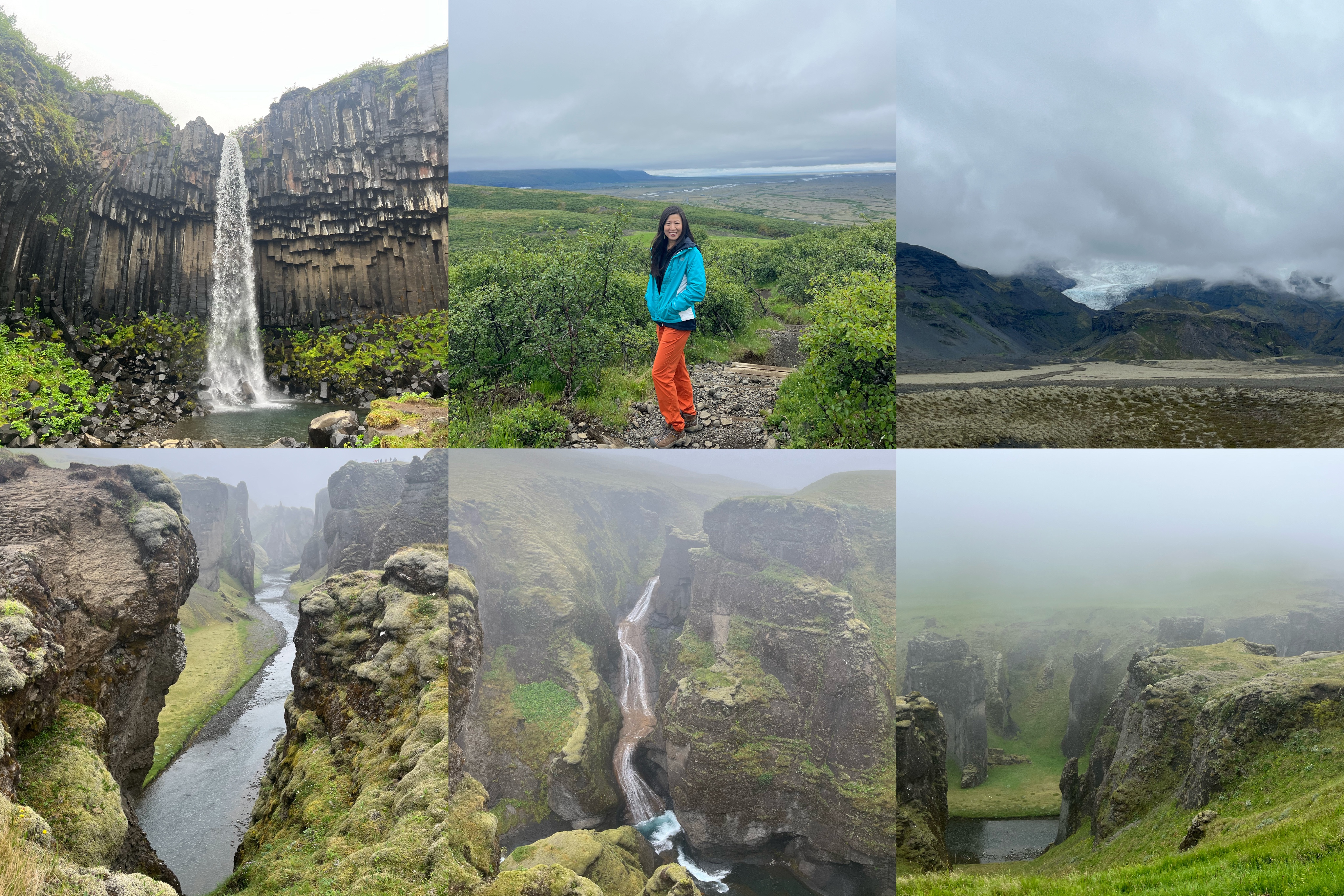 Fjaðrárgljúfur canyon trail, picture 4-6. Skaftafell National Park - Svartifoos trail, picture 1-2. Glacier view point by route 1, picture 3.