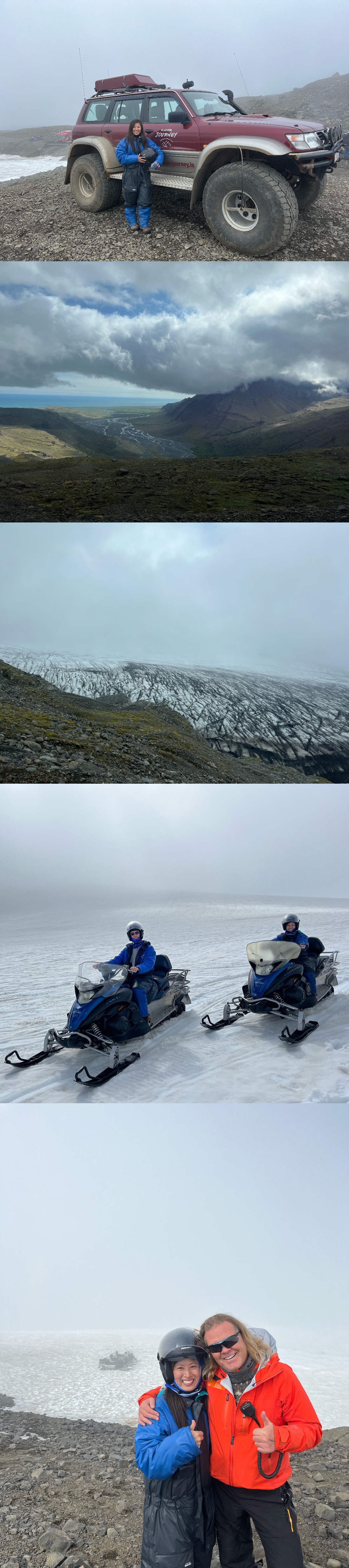Right after the boat tour, we rushed to our snowmobile tour. It turned out that we were the only two on the tour today, woohoo! Our guide Sven was an experienced guide with lots of stories. I felt like we were in the good hand. :) He told us we would be riding on the glaciers, which was different than snow☺️After we were suited, we hopped on the cool jeep and took the Froad up the mountains to our snowmobiles. The trip up was scary but Sven did a great job. He had been up soooo many times.