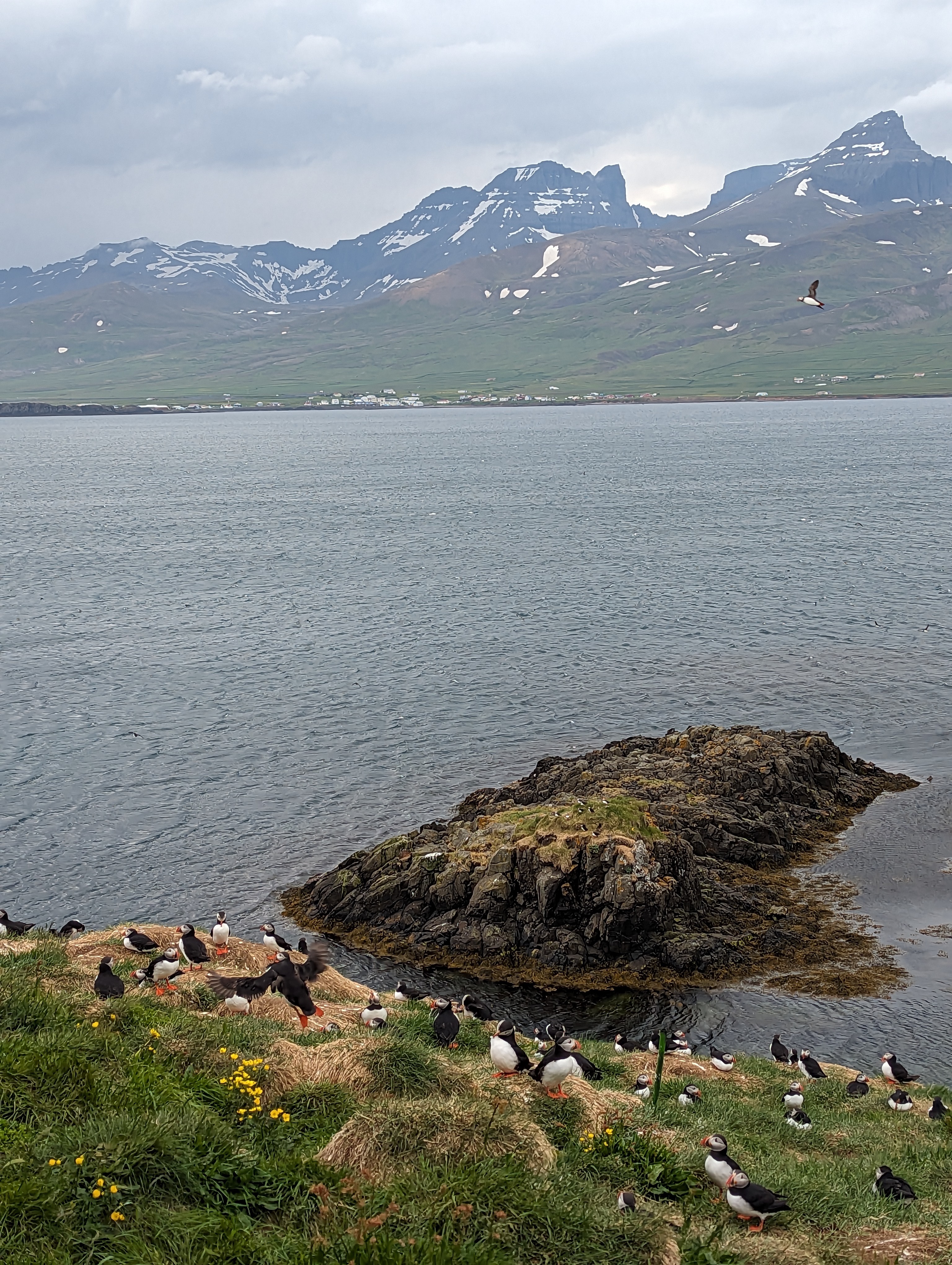 Highlight of the day is the PUFFINS at Borgarfjordur Eystir. We added in two extra hours driving to far north east to see them and I wasn’t disappointed! I took so many videos and pictures and enjoyed watching them flying off and back. Some were relaxing after a day at the sea. Some were fighting for nests…Our timing for being there was so perfect that we saw hundreds of them 👍