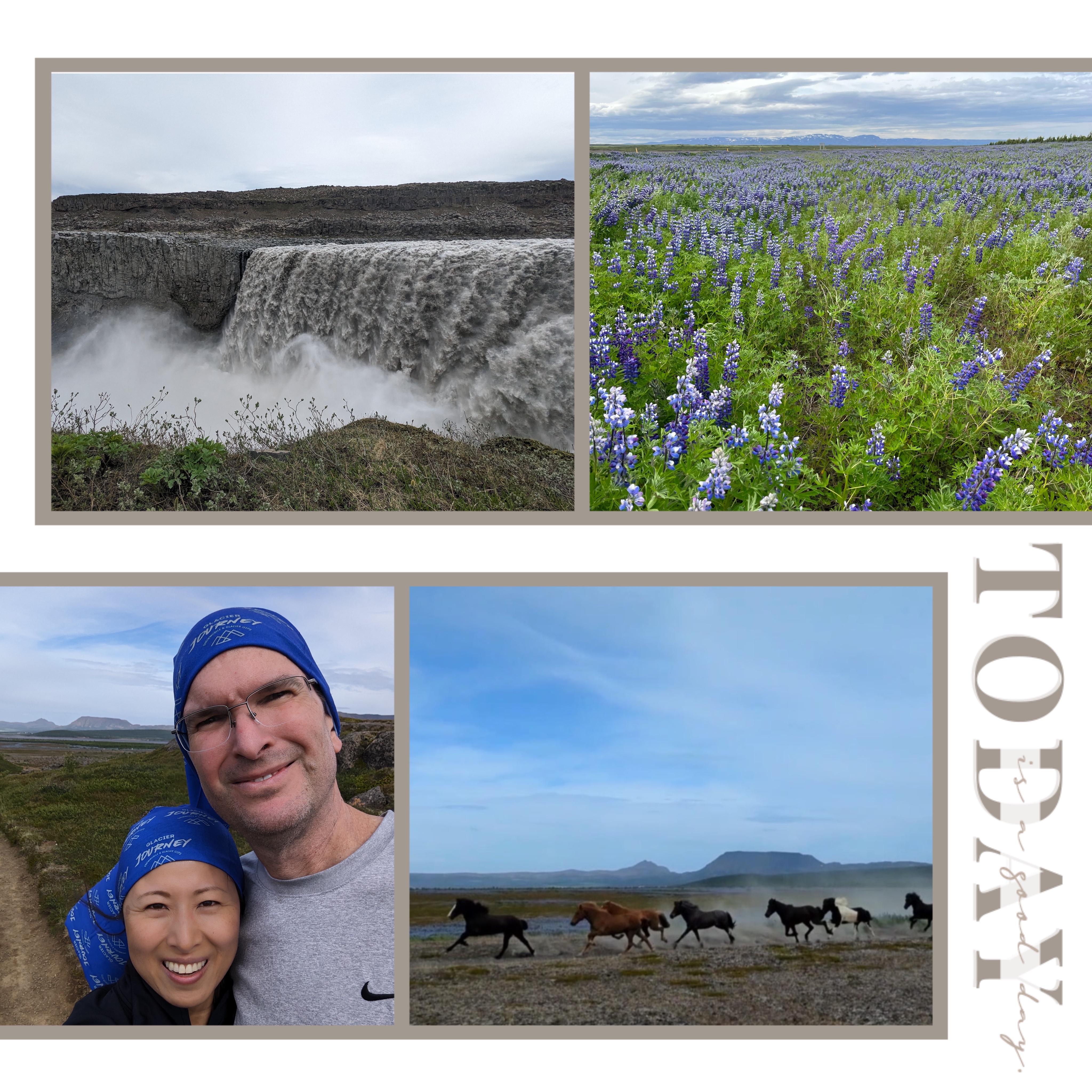 往西开,来到黛提瀑布,是欧洲最汹涌、排水量最大的瀑布。然后又去了Asbyrgi 峡谷,一般,没拍照,给两个徒步的酷哥酷妹来个自拍😉。一路景色还是一样的美,漫山遍野的鲁冰花。还赶上看到了马场的人放马,看到它们在大自然中奔跑,太美了!