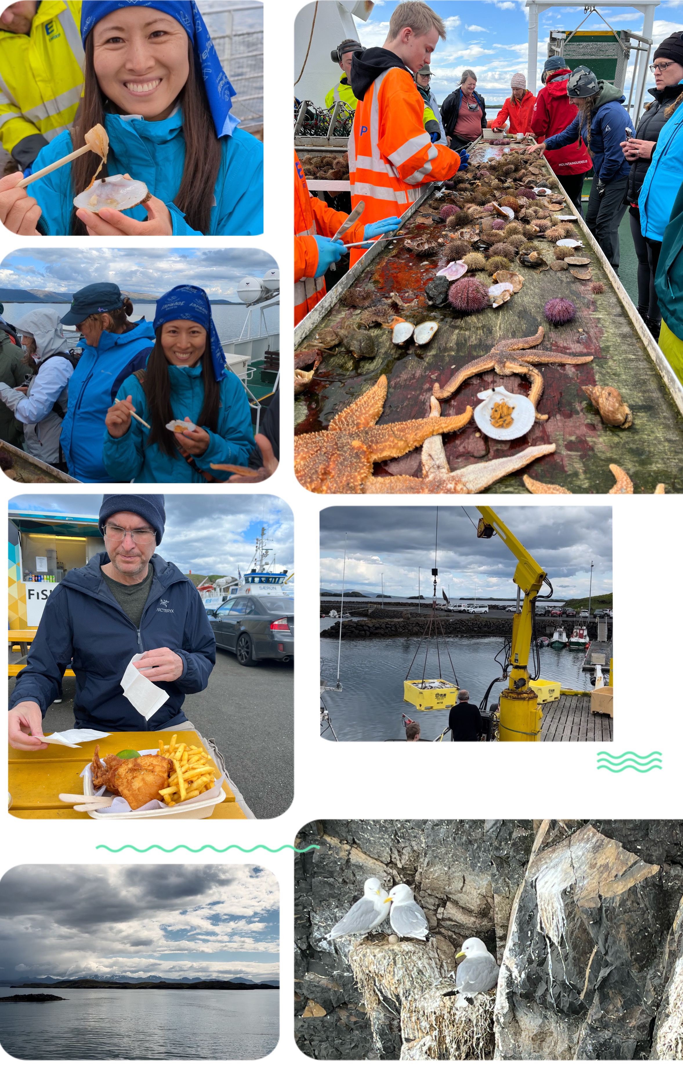 海边小摊吃了炸鱼炸薯条就上了船。船长带我们到几处看了海鸟,它们在岩石边沿筑巢,孵小鸟。开到中途,船员们又从海里打捞上来很多海胆、扇贝、海星、海螺…他们很娴熟的为大家打开扇贝和海胆(只有这两种可以吃),我第一个尝了扇贝,哇,好好吃啊!太新鲜了!海胆也很新鲜,不过大多尝到的是浓重的海水的咸味。尝得差不多了,剩下的就又丢回到海里。如果是条国内的船,我觉得那只螃蟹也会被生吃掉,还有海螺😁