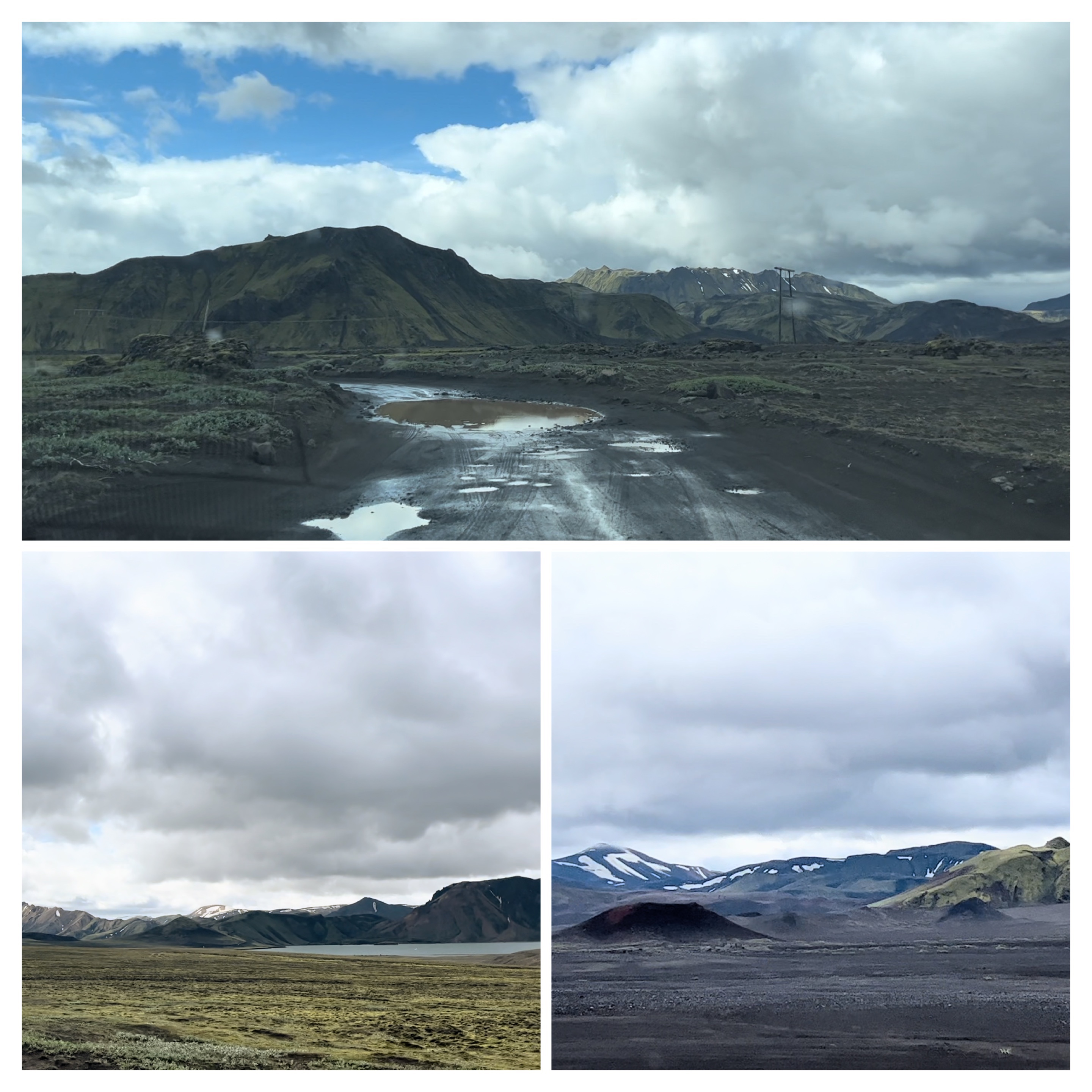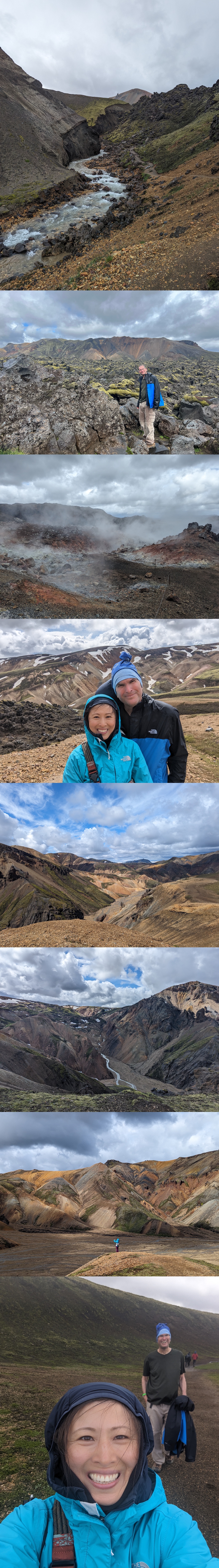The route we hiked took us to Mt. Brennisteinsalda, also called the Sulphur Wave, which is a rainbow-colored mountain in Landmannalaugar. This hike combines the best features of Landmannalaugar: lava fields, geothermal features, and panoramic views. We even got to hike a very short portion of the Laugavegur Trail, Iceland’s most famous multi-day trek. Altogether about 4 miles, 1000ft elevation. Drizzling here and there on our way up, but sun was out when we were up at the top!