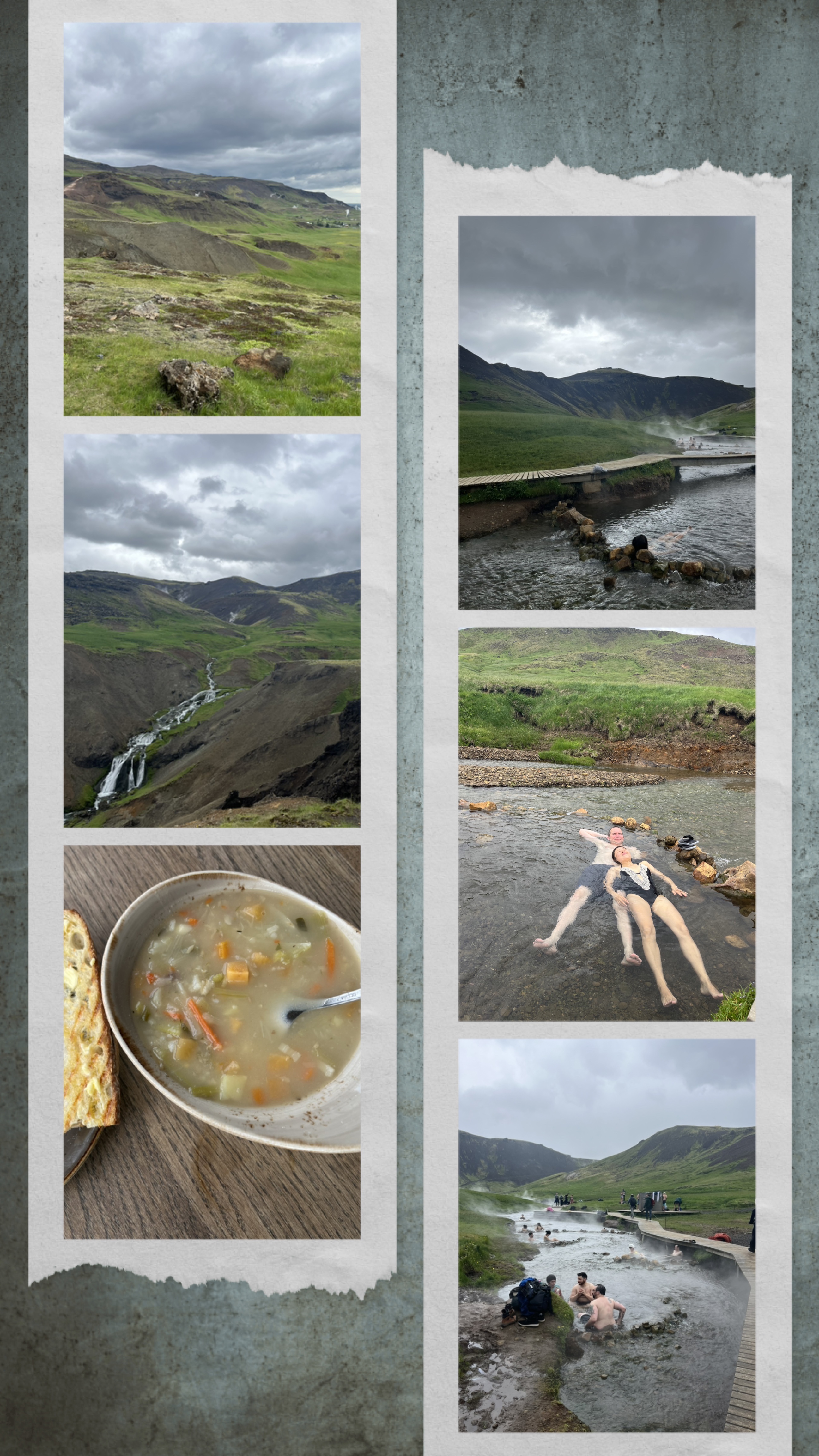 We woke up around 8am and went back to sleep until noon. So blessed that we were able to sleep that long. Today, we hiked Reykjadalur hot spring trail and soaked in the natural hot stream at the end of the trail. The trail is 5 miles long and 1134ft elevation. But the bath worth it all. Hot local lamb soup with bread right after hiking. What a nice day!