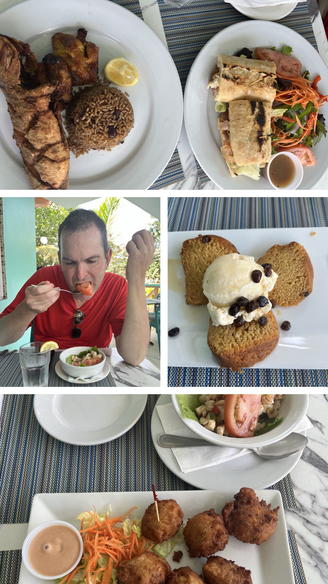 We had conch fritters, two orders of conch salad, conch chowder(didn’t make it to the picture), a whole fried fish, and blackened grouper sandwich, and rum cake with ice cream for desert. Our biggest meal. It was very good and our tummies were happy as well!